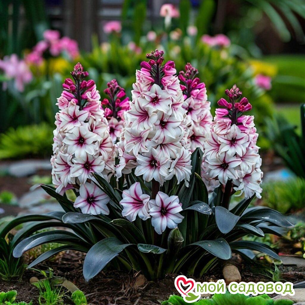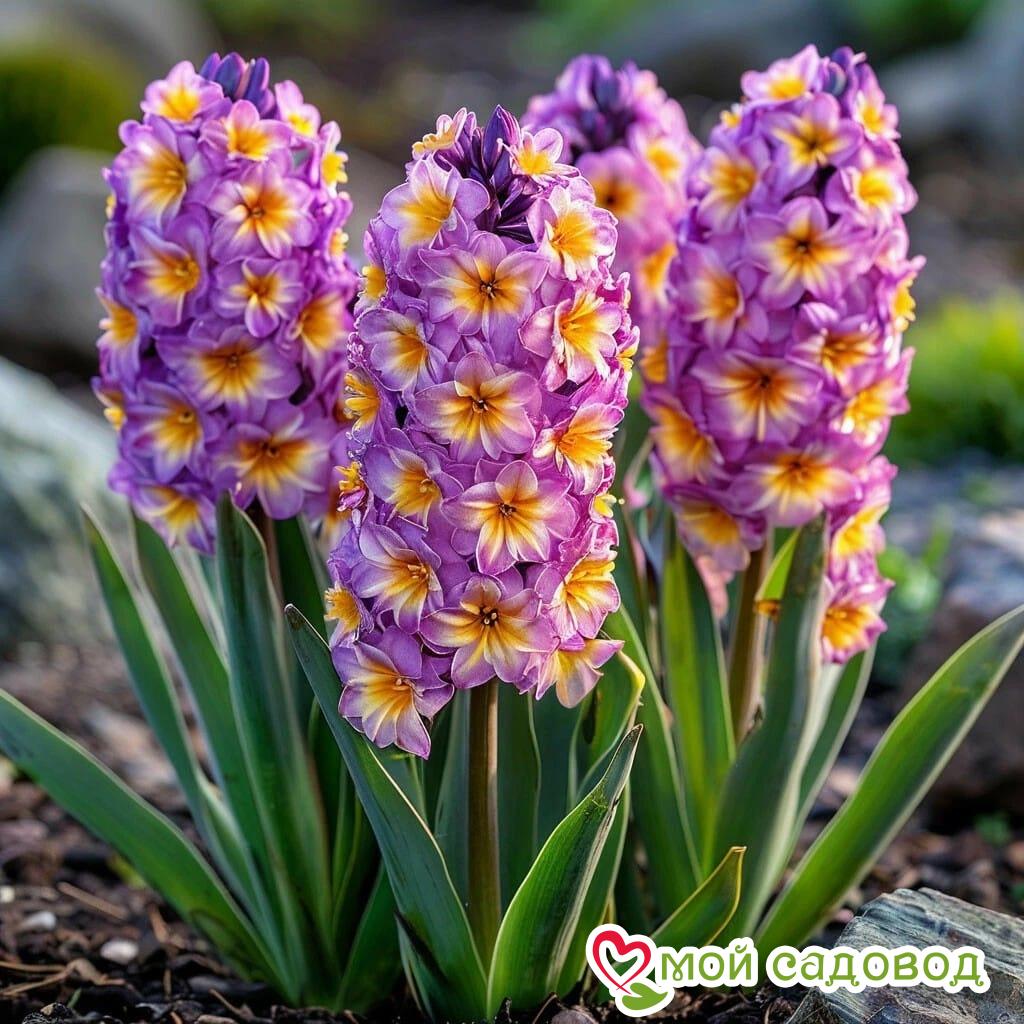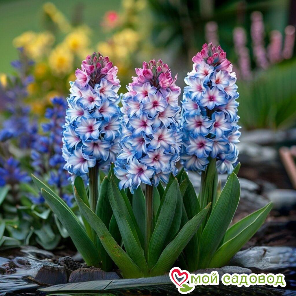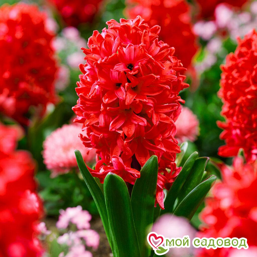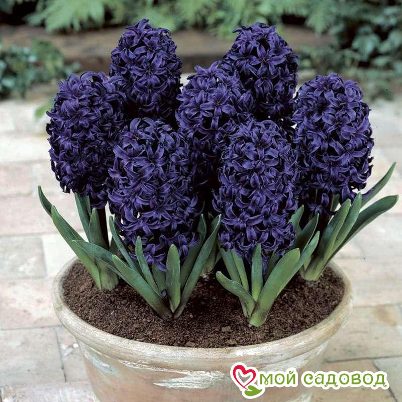 Садовые гиацинты принадлежат к семейству Liliaceae. Родом растение из стран Ближнего Востока и Средиземноморья. В естественной среде они встречаются на каменистых участках и на скалистых склонах. Выращенные из луковиц экземпляры могут достигать 15 – 30 см в высоту. Цветочные стебли образуются мощные и коренастые. Листья блестящие и длинные, размером 20 – 30 см. Они густо размещены в нижней части стебля. Цветки колоколообразной формы.