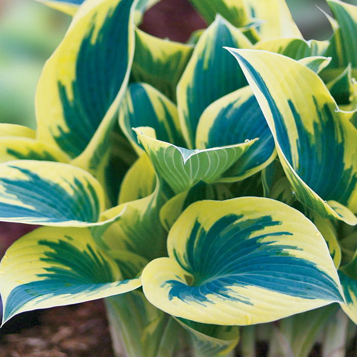 В высоту куст достигает 40 – 50 см. Диаметр его равен 50 – 65 см. Листва окрашена в сине-зеленый цвет, с красивым сизым оттенком. По краям просматривается желто-салатовая окантовка. Со временем она выгорает и приобретает сливочный оттенок. Листья плотные и гладкие, сердцевидной формы. Как правило, они собраны вверх.