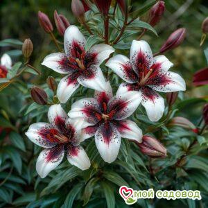 Цветки этого сорта крупные, достигающие 10-12 см в диаметре, имеют насыщенный бордово-вишневый оттенок белой серединой, который придает изысканность любому ландшафтному оформлению. Уникальная бархатистая текстура лепестков делает их особенно привлекательными и притягательными.