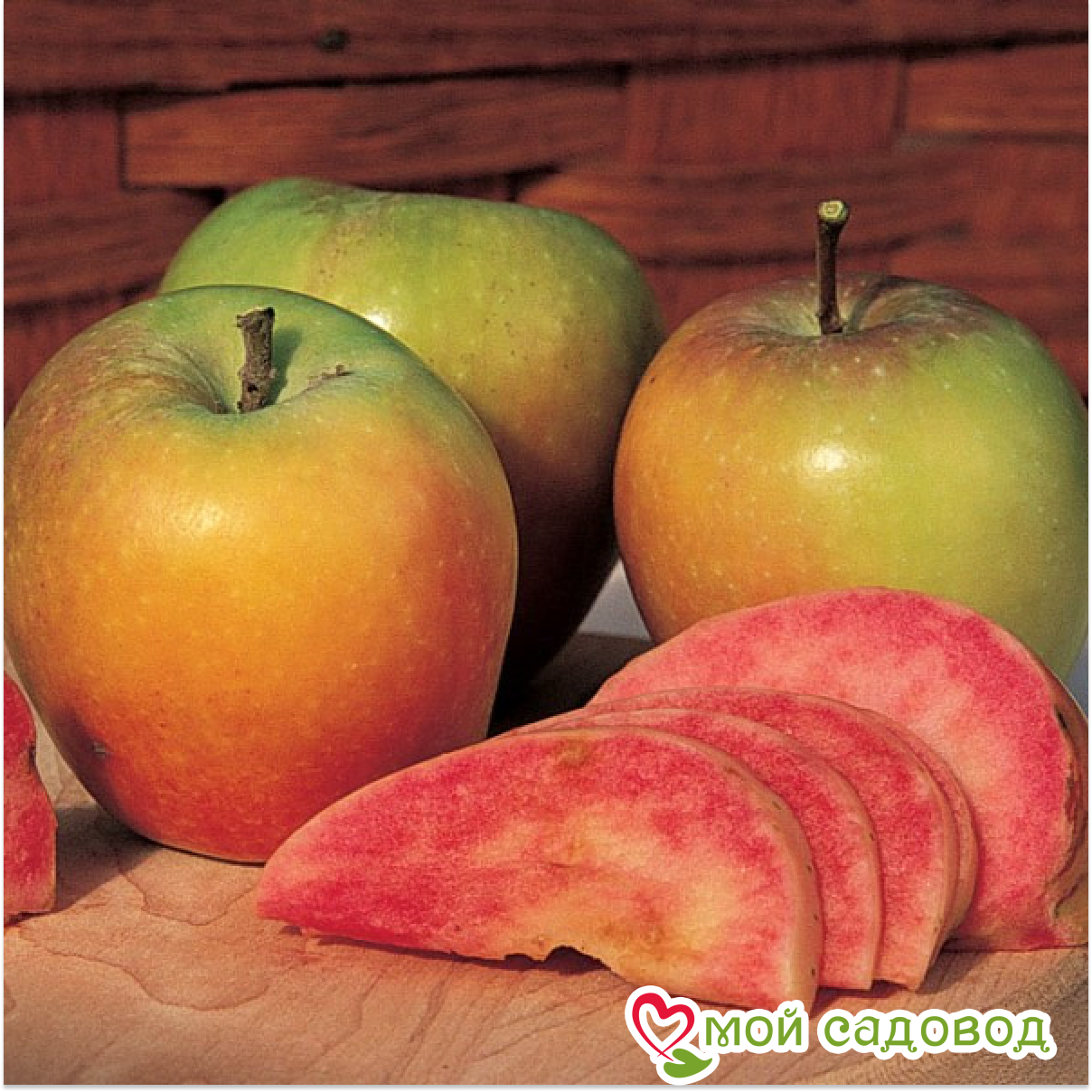 Яблоня Хидден Роуз (Hidden Rose) — поздне-осенний сорт яблони с розово-красной мякотью селекции США. Выведен в штате Орегон. Название сорта переводится как «Скрытая роза». Урожай созревает во второй половине сентября. Урожай отлично хранится до Нового Года. Плоды средних и крупных размеров, массой 120-150 г, отдельные до 200 г, что является хорошим стандартным результатом по крупности яблок, конической формы, желто-зеленые, с размытым оранжевым румянцем на половине плода. Кожица покрыта белыми точками, с небольшими розовыми пятнышками. Раскраска очень неординарная, броская, плоды внешне очень привлекательные. Мякоть насыщенно-розового цвета, очень сочная, хрустящая, очень ароматная, отличного сбалансированного кисло-сладкого вкуса, с небольшой изысканной терпкостью в первое время после сбора урожая, которая потом пропадает. Вкусовые качества отличные, становятся более высокими после некоторого периода улеживания и набирают большую сладость и аромат. Место посадки Главное условие при выборе места для посадки яблони — уровень залегания грунтовых вод. Высокое их стояние приводит к отмиранию корневой системы. В результате наблюдается явление суховершинности кроны, растение слабеет и погибает. Не подходят для яблонь и заболоченные участки, а также сухие песчаные почвы при близком залегании извести, щебня, плотных горизонтов глин. Место для посадки должно быть защищено от холодных северных ветров. В нашем интернет-магазине вы сможете купить Саженцы яблони Так же возможно вас заинтересуют Яблоня Джонатан и Яблоня Старк эрлиест