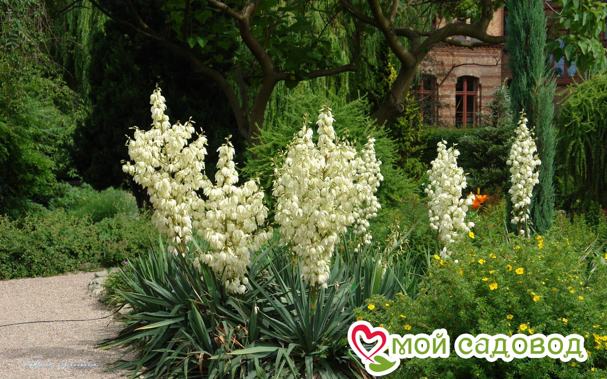 Юкка эффектно смотрится в одиночных посадках, на фоне стриженного газона. Также ее выращивают в бордюрах и на опушках небольших групп деревьев. Это отличный способ украсить сухие каменистые склоны.